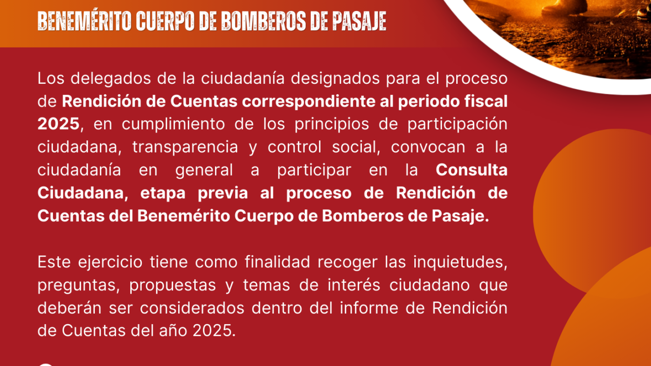 El Cuerpo de Bomberos Municipal del cantón Pasaje tiene el agrado de invitar a todos los ciudadanos a su evento anual de “Rendición de Cuentas 2023”. En esta ocasión, podrás…