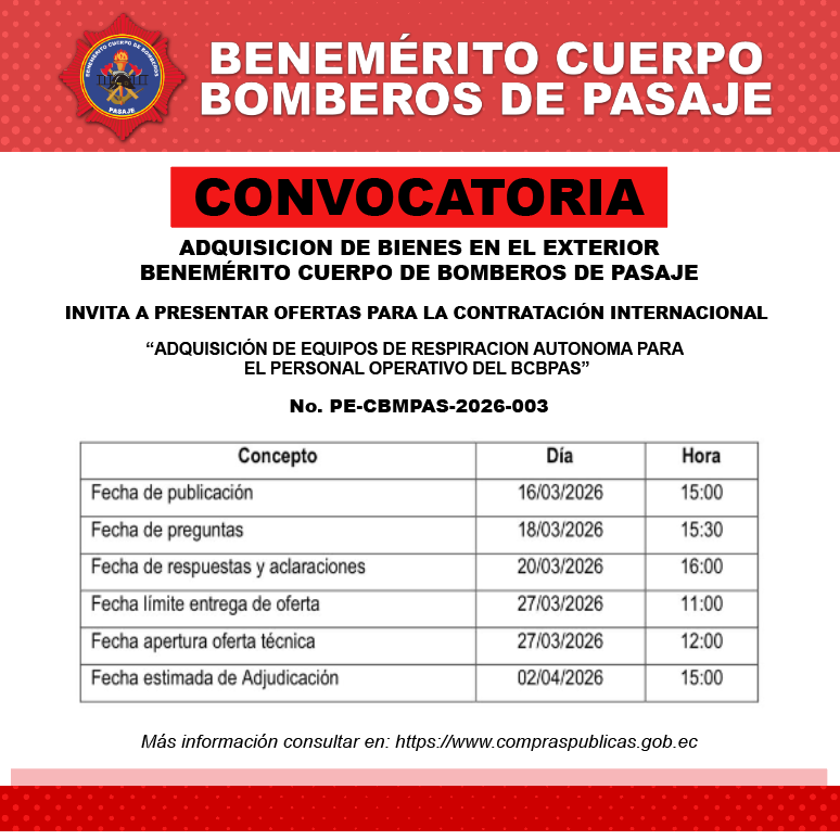 El Benemérito Cuerpo de Bomberos de Pasaje comunica el inicio del proceso de contratación internacional para la: