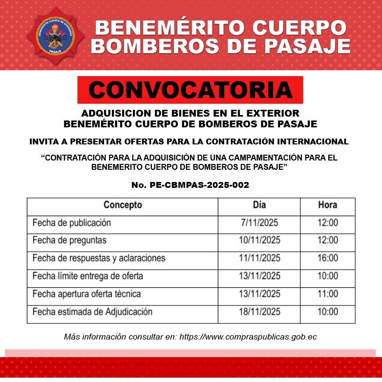 El Benemérito Cuerpo de Bomberos de Pasaje invita a presentar ofertas para la contratación internacional denominada: