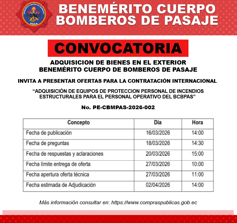 CONVOCATORIA DE CONTRATACIÓN INTERNACIONAL El Benemérito Cuerpo de Bomberos de Pasaje invita a personas naturales y jurídicas extranjeras a participar en el proceso de adquisición de: EQUIPOS DE…