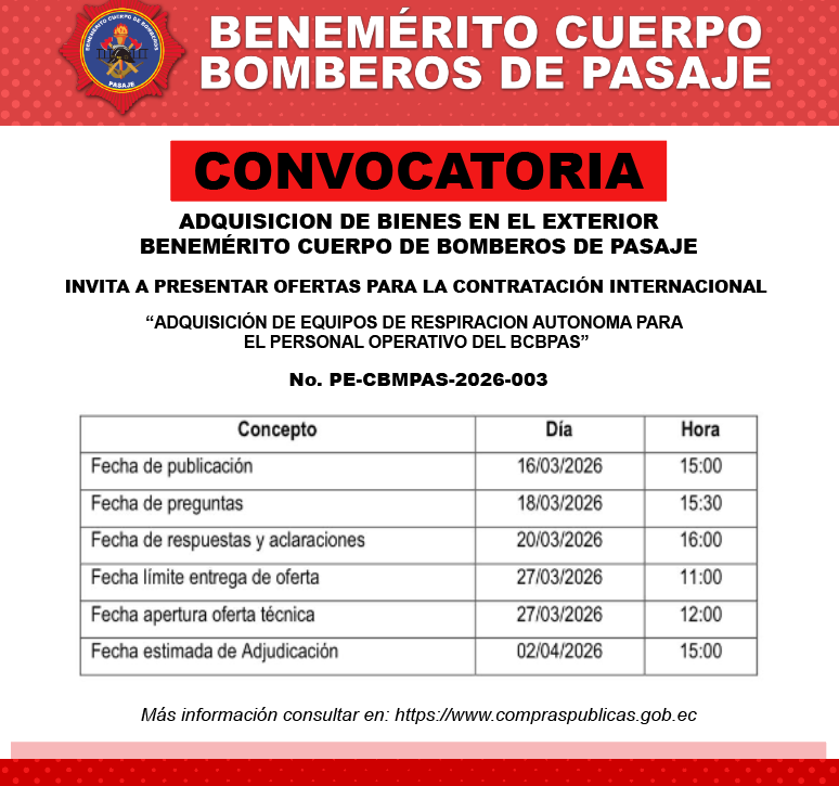 NUEVA CONVOCATORIA: ADQUISICIÓN DE EQUIPOS DE RESPIRACIÓN El Benemérito Cuerpo de Bomberos de Pasaje comunica el inicio del proceso de contratación internacional para la: "ADQUISICIÓN DE EQUIPOS DE…